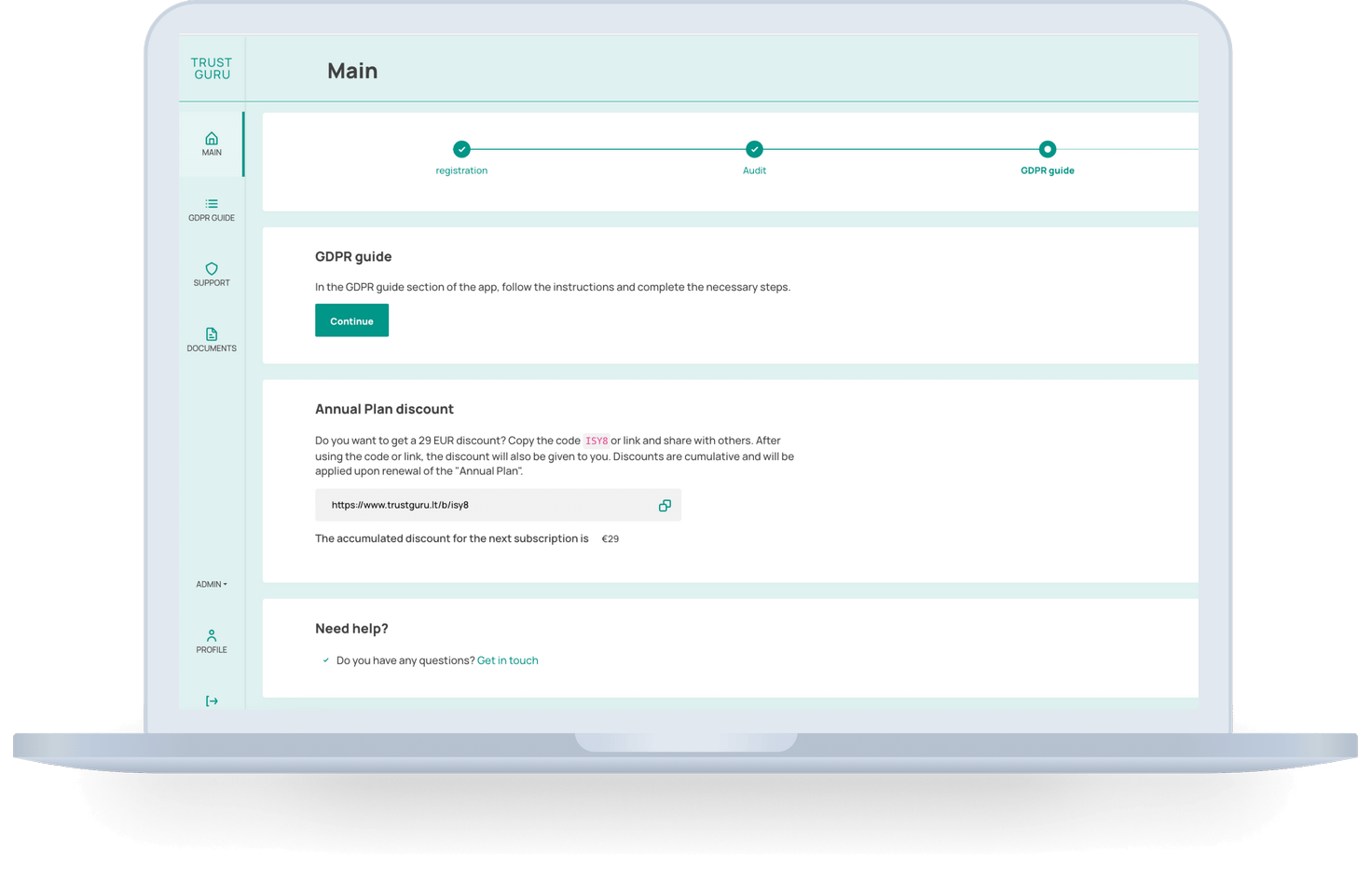TrustGuru is your digital solution for General Data Protection Regulation (GDPR) compliance. Our tool generates, customizes, updates documents, provides training, and guides you through necessary actions.